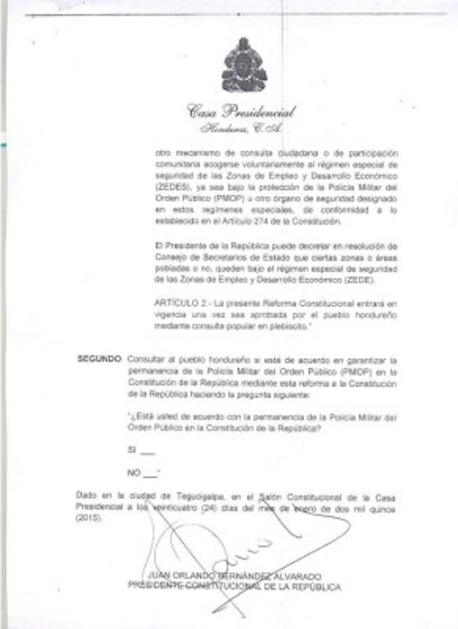 SEGUNDO: Consultar al pueblo hondureño si está de acuerdo en garantizar la permanencia de la Policía Militar del Orden Público (PMOP) en la Constitución de la República mediante esta reforma a la Constitución de la República haciendo la pregunta siguiente: