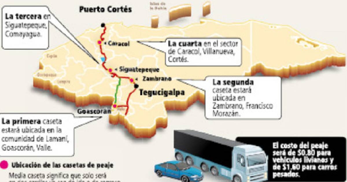 En este lugar se cobrará 80 centavos de dólar a los vehículos livianos y 1.60 dólares a los pesados. La segunda caseta estará en Zambrano, Francisco Morazán. La tercera en Siguatepeque, Comayagua, y la cuarta en el sector de Caracol, Villanueva, Cortés, cerca de San Pedro Sula.