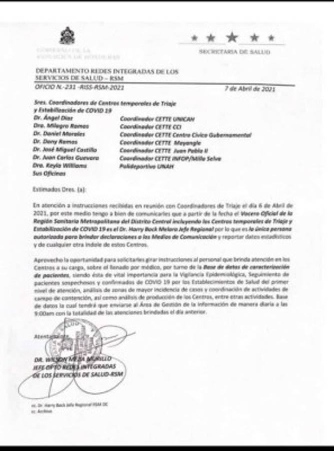 El documento ordena a los encargados de los triajes ubicados en UNICAH, CCI; Centro Civico Gubernamental, Mayangle, Juan Pablo II, INFOP/Milla Selva y Polideportivo UNAH, a abstenerse de reportar datos estadísticos, declaraciones y de cualquier otra indole de estos centro.