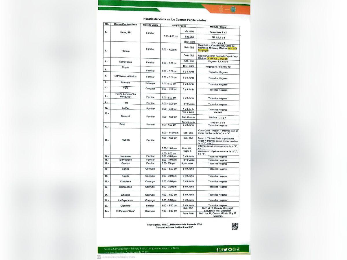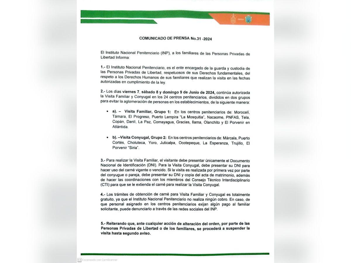 De acuerdo a un comunicado, la institución precisó que esta medida aplica para la Penitenciaría Nacional “Marco Aurelio Soto” ubicada en Támara, la Penitenciaría Nacional Femenina de Asistencia Social (PNFAS), “El Pozo I” situado en Ilama, Santa Bárbara, y la cárcel “La Tolva” en Morocelí, El Paraíso.