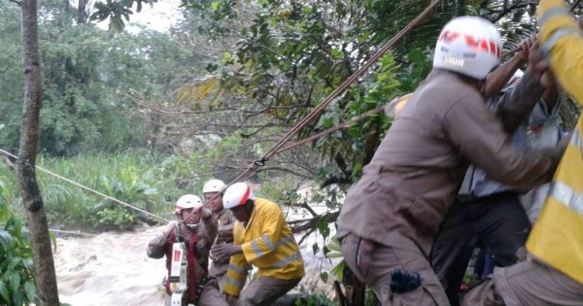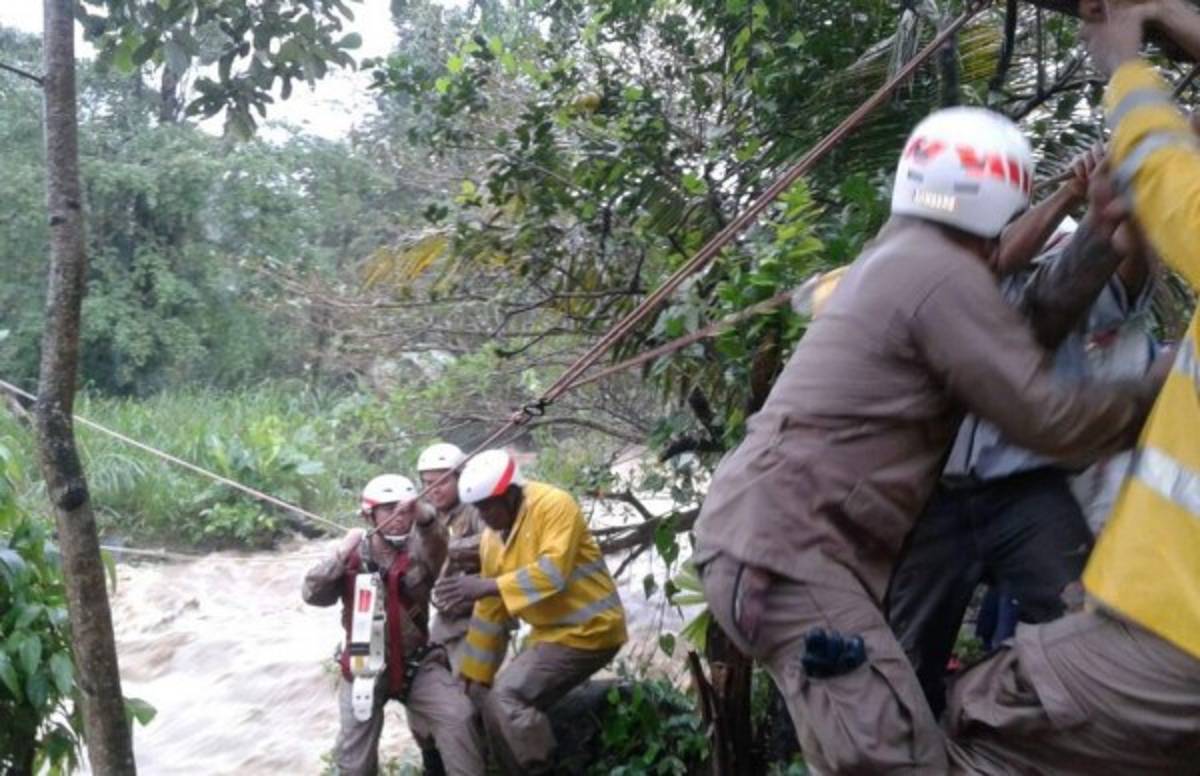 En la zona, miembros del Cuerpo de Bomberos realizaron el rescate de seis pobladores, mediante cuerdas, al quedar atrapados por el caudal del agua en la aldea San Carlos.