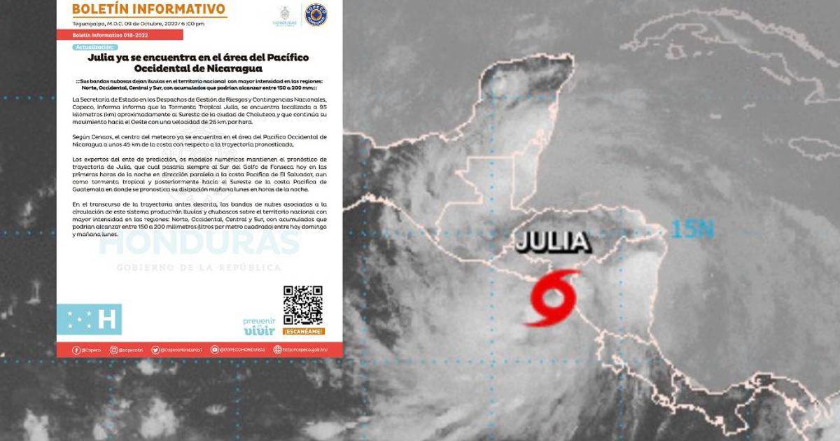TEGUCIGALPA, HONDURAS.- La tormenta tropical Julia, que recientemente era huracán categoría 1, avanza frente al sur de Honduras, ubicándose a 95 kilómetros de Choluteca. Sus bandas nubosas dejarán lluvias intensas en al menos cuatro regiones, de acuerdo al último boletín de la Comisión Permanente de Contingencias (Copeco).