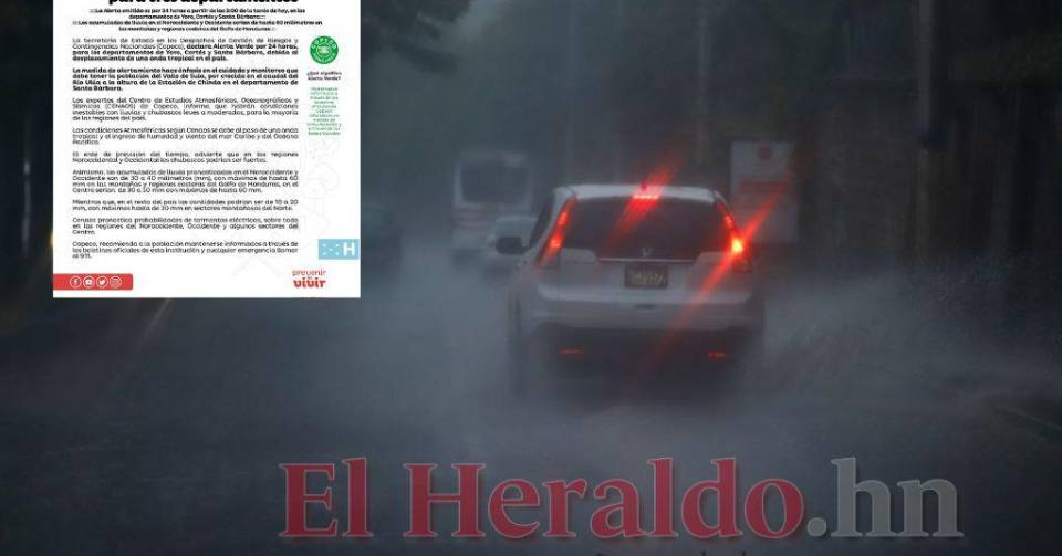 TEGUCIGALPA, HONDURAS.- Cortés, Santa Bárbara, Copán, Ocotepeque y Lempira permanecen bajo alerta verde hasta el 19 de agosto, informó la Secretaría de Estado en los Despachos de Gestión de Riesgos y Contingencias Nacionales (Copeco) debido al desplazamiento de una onda tropical que ingresó al país el pasado martes -16 de agosto-.