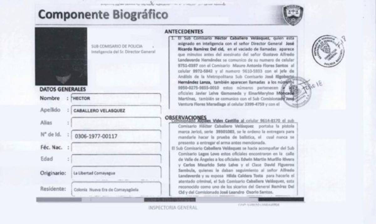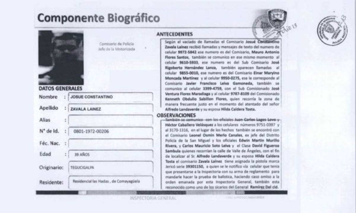 También se comunicó con los oficiales Juan Carlos Lagos Lovo y Héctor Caballero Velásquez a los celulares 9751-0397 y 3170-1316, en el lugar de los hechos también se encontró con el comisario Leonel Osmin Merlo Canales exjefe del Distrito Policial de la San Miguel y los oficiales Edwin Martin Murillo Rivera y Carlos Mauricio Soto Leiva y el Clase David Figueroa Sambula quienes recorrían la calle de Valle de Ángeles con el fin de localizar al Sr. Alfredo Landaverde y su esposa Hilda Caldera Tosta el comisionado Zavala Laínez tiene asignada la pistola marca Jericó serie 39301150 a quien se le notificó via celular que tenía que presentarse a la inspectoría con su arma de reglamento para mandar hacer la prueba de balística, haciendo caso omiso a la orden emanada de esta inspectoría General, también está reconocido como sicario del General Ramírez Del Cid.