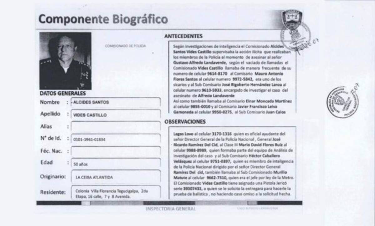 Según el vaciado de llamadas el comisario recibió llamadas y mensajes de texto del número de celular 9972-5842 ese número es del Comisario Mario Antonio Flores Santos, también se comunicó en ese momento al celular 9610-5933 ese número es del Comisario Elnar Maryino Moncada Martínez y al celular 9950-0275 ese corresponde al Comisario Javier Francisco Leiva Gamoneda, también se comunicó al celular 3399-4759 con el subcomisionado José Ventura Flores Maradiaga y al celular 9787-8109 del Comisionado Kenneth Obdulio Sabillón Flores quien recorría la zona de manera frecuente justo en el momento del atentado del señor Alfredo Landaverde y su esposa Hilda Caldera Tosta.