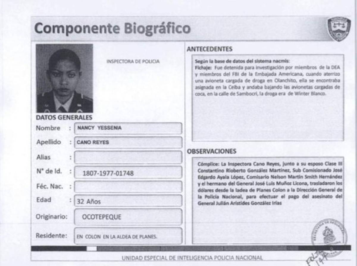 Cómplice: La inspectora Cano Reyes junto a su esposo clase III Constantino Rioberto González Martínez, Subcomisionado José Edgardo Ayala López, Comisario Nelson Martínez Smith Hernández y el hermano del general José Luis Muños Licona trasladaron los dólares desde la aldea de Planes Colón a la Dirección general de la Policía Nacional, para efectuar el pago des asesinato del General Julián Arístides González Irías.