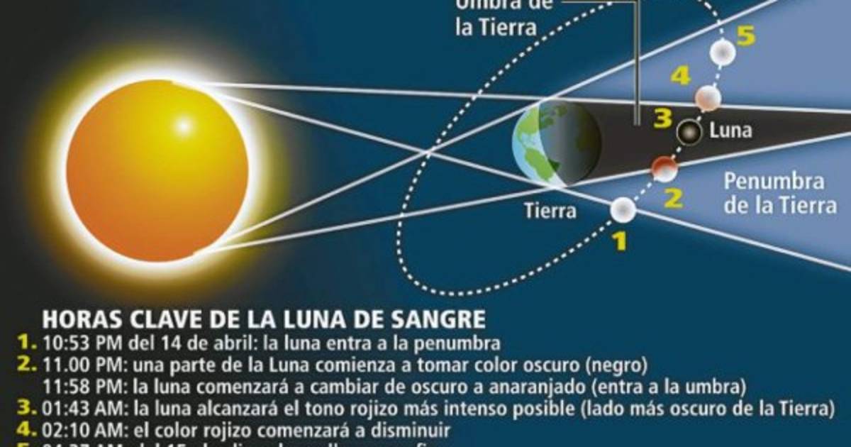 Al filo de las 10:53 de la noche del lunes 14 de abril la luna comenzará a pasar por la penumbra de la Tierra, lo que, momentáneamente, generará una mancha oscura y negra en una buena parte de la luna.