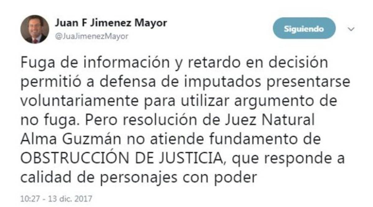 'Fuga de información y retardo en decisión permitió a defensa de imputados presentarse voluntariamente para utilizar argumento de no fuga. Pero resolución de Juez Natural Alma Guzmán no atiende fundamento de OBSTRUCCIÓN DE JUSTICIA, que responde a calidad de personajes con poder', escribió el funcionario de la Organización de Estados Americanos.