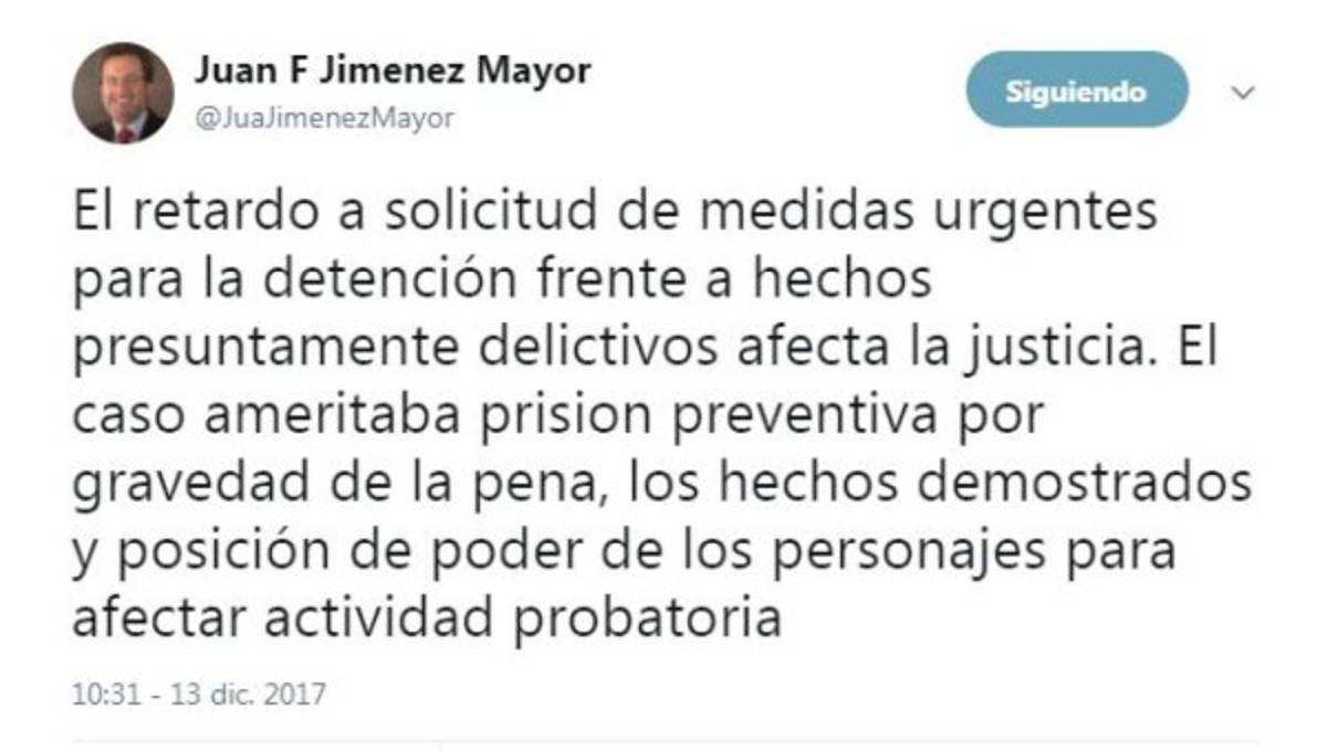 'El retardo a solicitud de medidas urgentes para la detención frente a hechos presuntamente delictivos afecta la justicia. El caso ameritaba prision preventiva por gravedad de la pena, los hechos demostrados y posición de poder de los personajes para afectar actividad probatoria', compartió en otro de sus tuits el sudamericano.