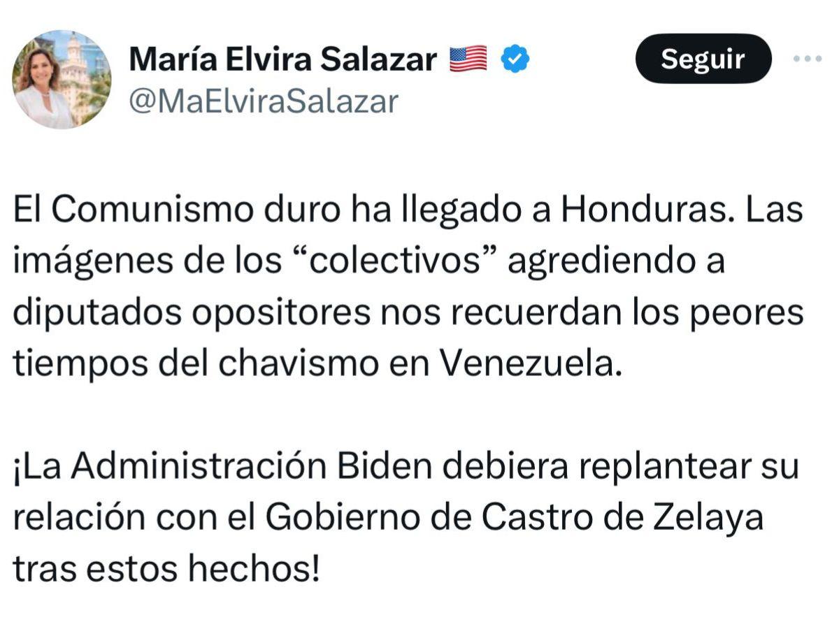 “El Comunismo duro ha llegado a Honduras. Las imágenes de los “colectivos” agrediendo a diputados opositores nos recuerdan los peores tiempos del chavismo en Venezuela”, publicó la parlamentaria norteamericana a través de su cuenta personal de X (antes Twitter).