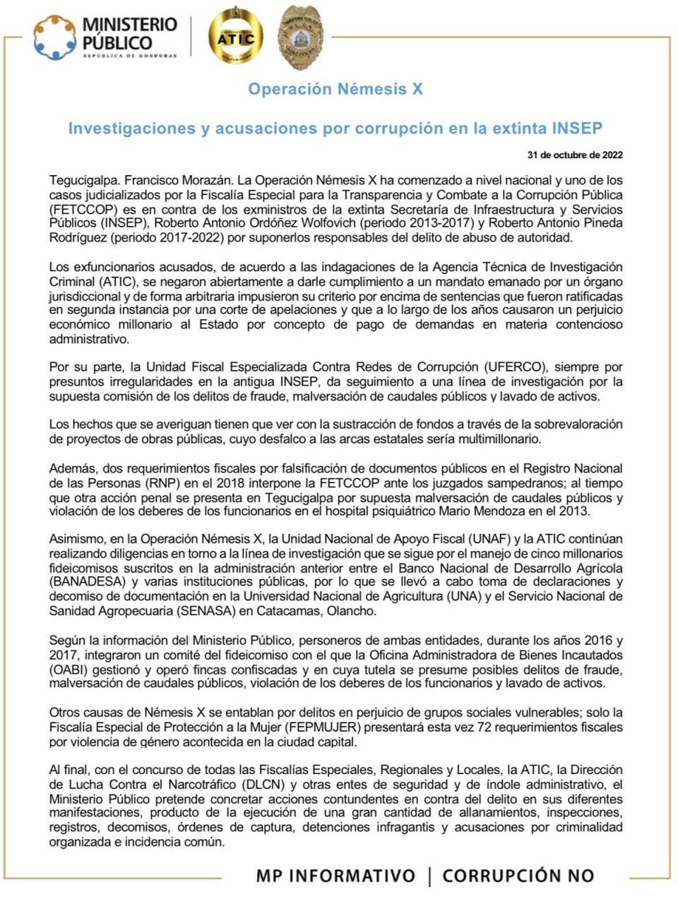 Este proceso de Investigaciones y acusaciones por corrupción en la extinta INSEP tiene como nombre Operación Némesis X.