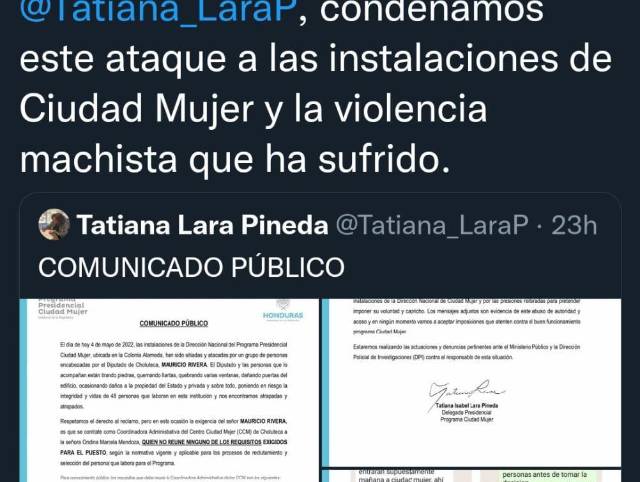 “Estamos con usted compañera Tatiana Lara Pineda. Condenamos este ataque a las instalaciones de Ciudad Mujer y la violencia machista que ha sufrido”, externó Roque.
