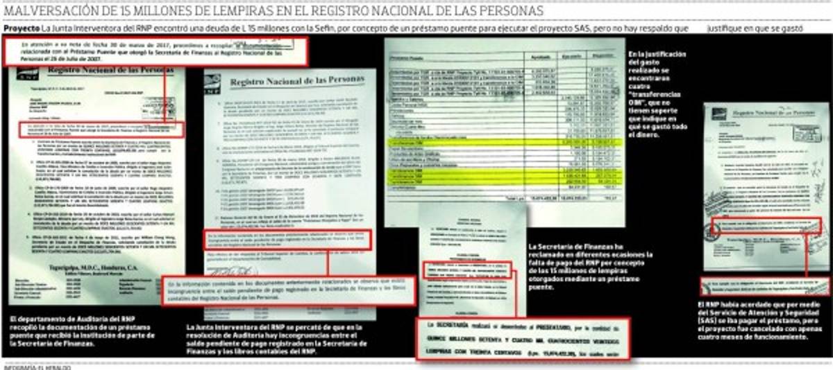 El oficio No. 47-2017-DAI-RNP enviado el pasado 3 de abril de 2017 por el departamento de Auditoría Interna del Registro Nacional de las Personas (RNP) a la Dirección General es la recopilación de la documentación relacionada con un préstamo puente de 15 millones de lempiras que le otorgó la Secretaría de Finanzas (Sefin) a la institución para supuestamente cumplir con la “transformación y fortalecimiento institucional del RNP”, pero que según la investigación de auditoría tiene “incongruencias entre el pago pendiente a Sefin y los libros contables”.
