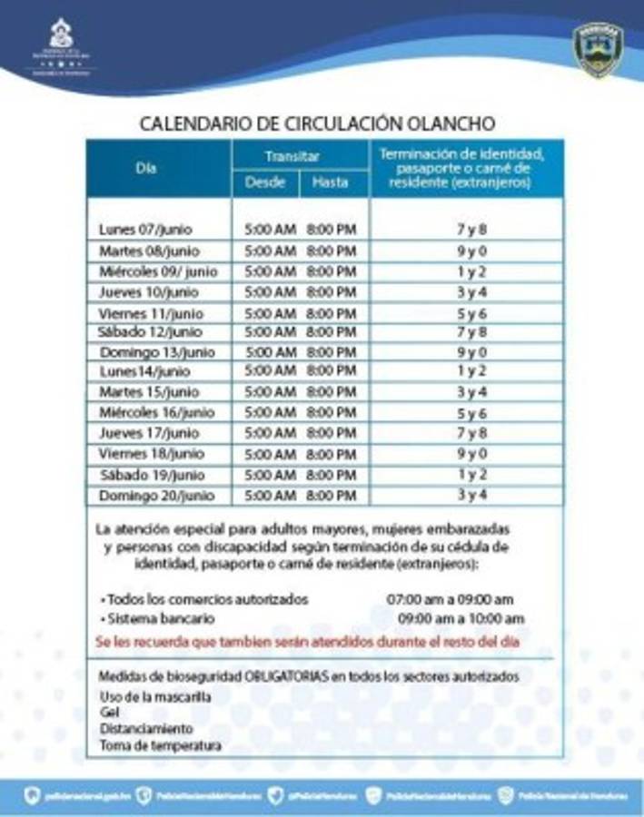 La circulación de la población en el Olancho se realizará según el último dígito de su tarjeta de identificación, pasaporte o carné de residente en el caso de los extranjeros en un horario de 5:00 AM a 8:00 PM.