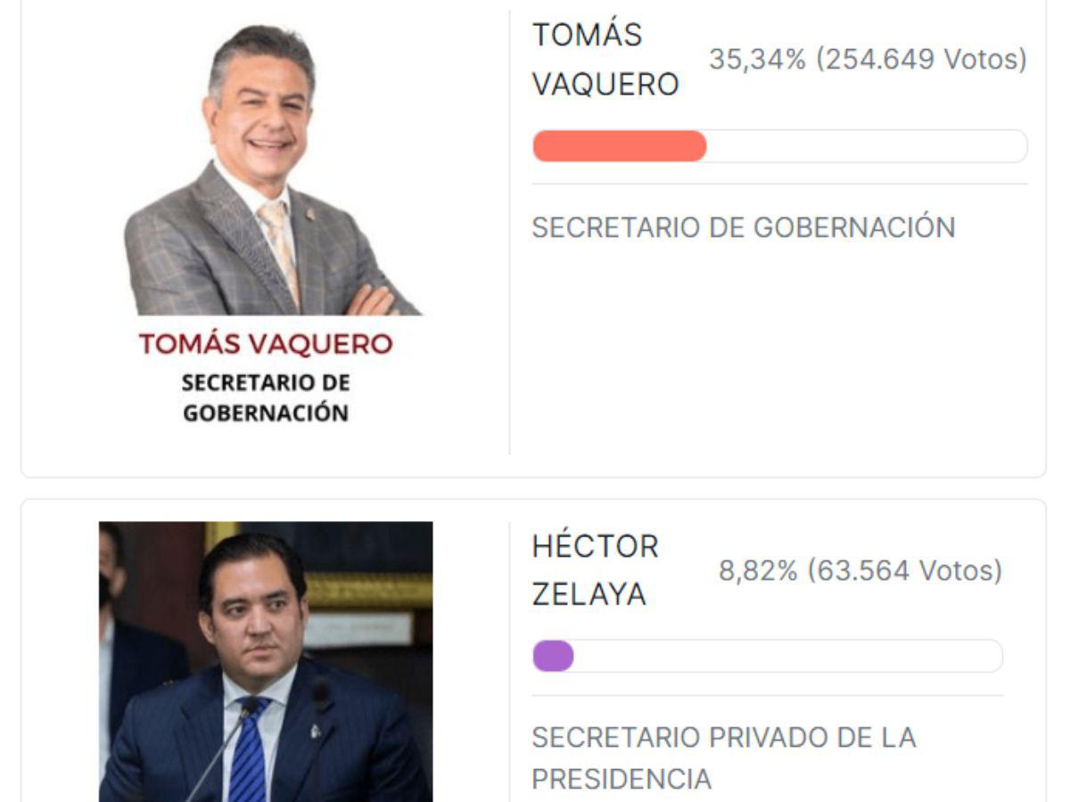 El segundo lugar fue para Tomás Vaquero, secretario de Gobernación, Justicia y Descentralización, con un total de 254,649 votos, lo que representó el 35.34% de los participantes. En 2022 él fue elegido como el mejor funcionario del gabinete de Xiomara Castro, según una votación que estuvo vigente desde el 1 de diciembre y hasta el sábado 31 de ese año.