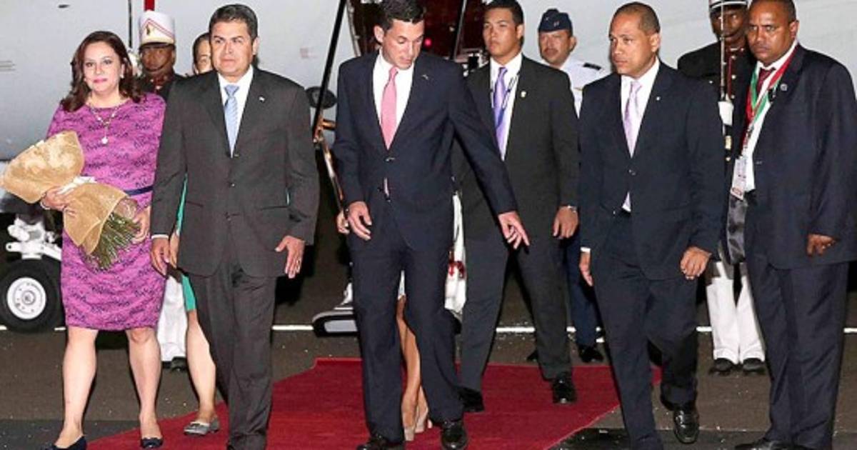 Instante en que el presidente de la República, Juan Orlando Hernández, arriba junto a su esposa Ana García a la Ciudad de Panamá para participar en la VII Cumbre de las Américas.