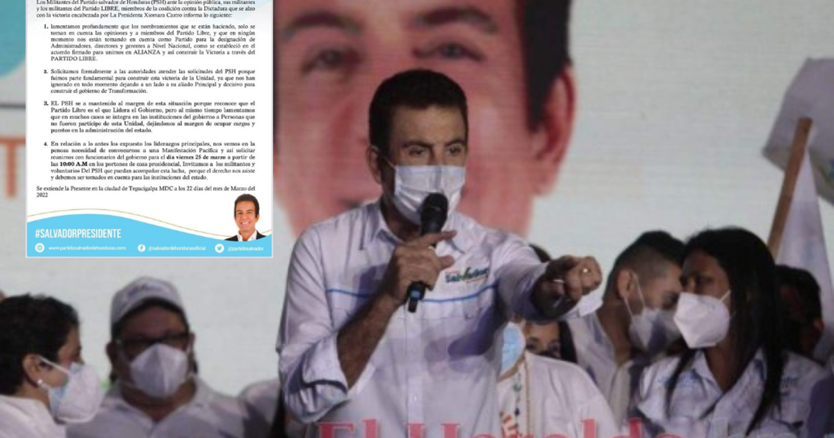 De acuerdo a un comunicado emitido este martes, los miembros del PSH manifiestan su descontento ya que ninguno de sus líderes ha sido designado como administradores, directores o gerentes; en su lugar han sido nombradas personas ajenas a la alianza.