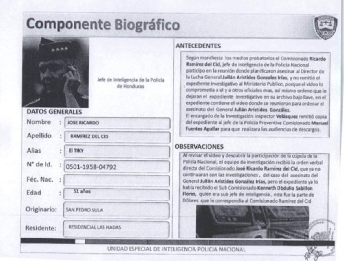 Según manifiestan los medios probatorios, el comisionado Ricardo Ramírez del Cid, jefe de Inteligencia de la Policía Nacional, participó en la reunión donde planificaron asesinar al director de Lucha general Julián Arístides González Irías y no remitió el expediente investigativo al Ministerio Público, porque el video lo comprometía a él y a otros oficiales más; asimismo, ordenó que le dejaran el expediente investigativo en su archivo bajo llave, en el expediente contiene el video donde se reunieron para ordenar el asesinato del general Julián Arístides González.