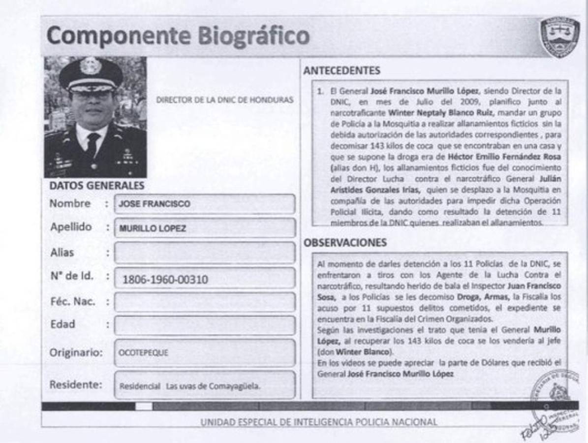 El general José Francisco Murillo López, siendo director de la DNIC, en mes de julio del 2009, planificó junto al narcotraficante Winter Neptaly Blanco Ruíz, mandar un grupo de Policía a la Mosquitia a realizar allanamientos ficticios sin la debida autorización de las autoridades correspondientes, para decomisar 143 kilos de coca que se encontraban en una casa y que se supone la droga era de Héctor Emilio Fernández Rosa (alias don H), los allanamientos ficticios fue conocimiento del director de Lucha contra el narcotráfico general Julián Arístides González Irías, quien se desplazó a la Mosquitía en compañía de las autoridades para impedir dicha operación policial ilícita, dando como resultado la detención de 11 miembros de la DNIC, quienes realizaban el allanamiento.