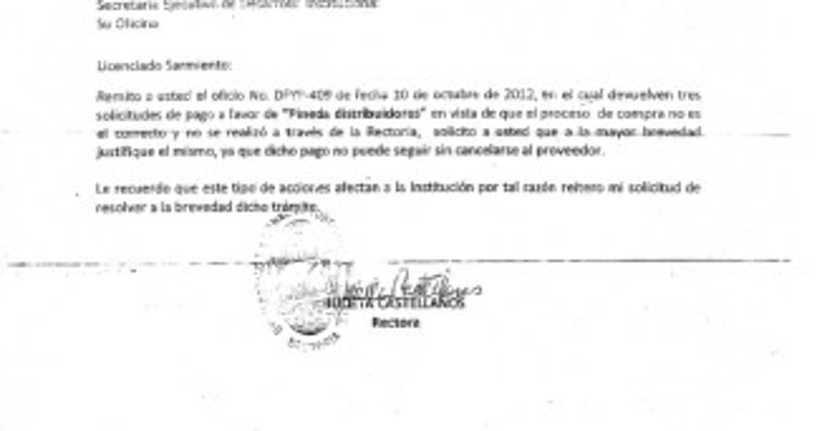 La nota, que firma la rectora, dice que “devuelven tres solicitudes de pago a favor de ‘Pineda Distribuidores’ en vista que el proceso de compra no es el correcto y no se realizó a través de la Rectoría, solicito a usted que a la mayor brevedad justifique el mismo, ya que dicho pago no puede seguir sin cancelarse al proveedor”.