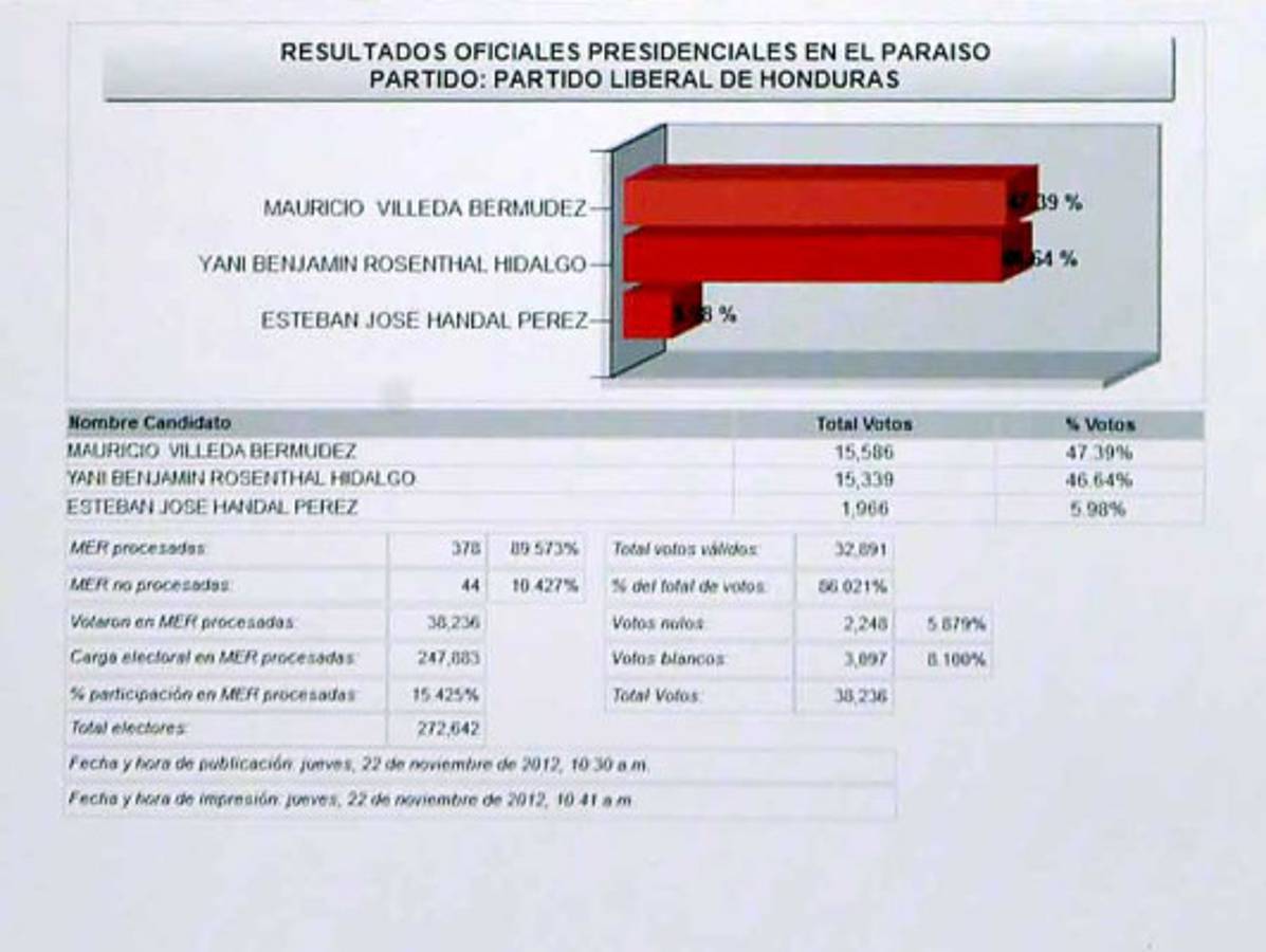 se mantiene muy cerca de Villeda con el 47.31 por ciento, es decir con 91,650 votos, una diferencia de apenas 2,525 sufragios, el 1.3 por ciento.