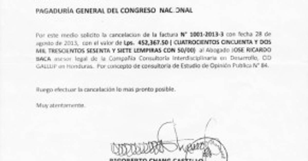 Uno de los tres documentos presentados por Romeo Vásquez donde aparece presuntamente la firma de Chang Castillo. El nacionalista aclaró que el documento es apócrifo y que él no tiene ni la facultad de ordenar pagos.