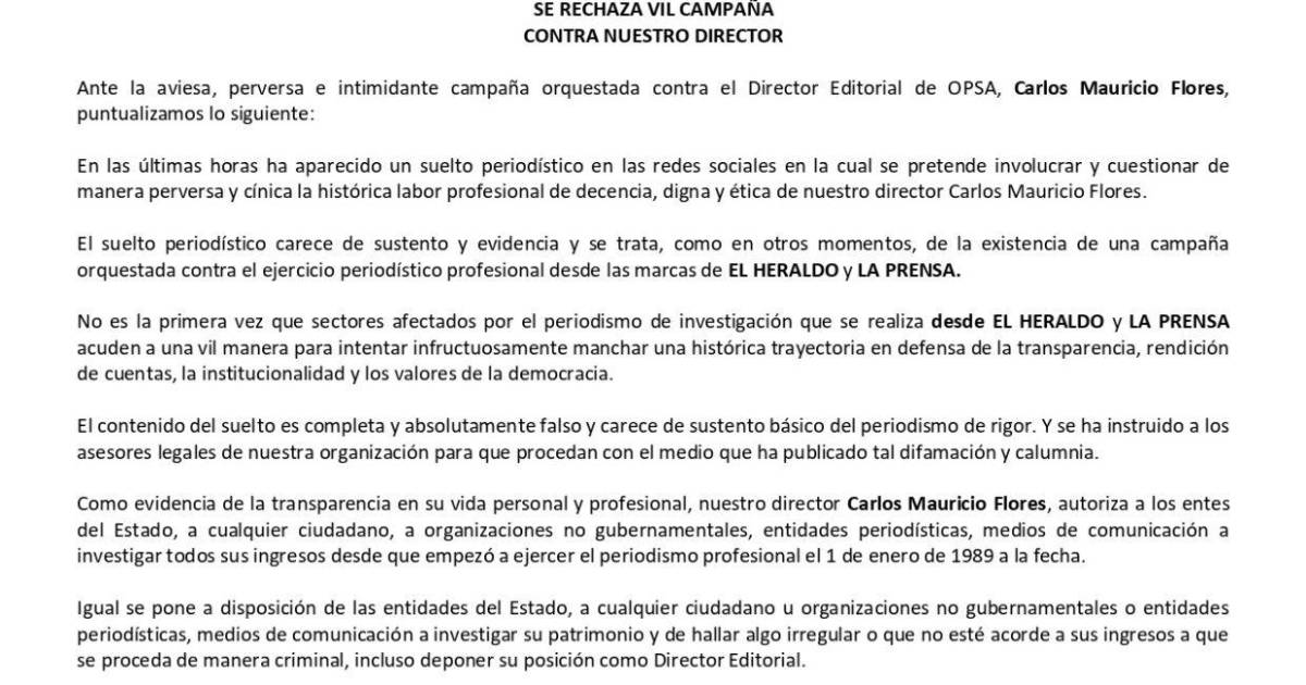 Tegucigalpa, Honduras.- El Director Editorial de OPSA, con sus marcas de LA PRENSA Y EL HERALDO, Carlos Mauricio Flores, rechazó este martes 24 de febrero las perversas y viles conexiones que hacen en un suelto periodístico, pretendiendo poner en duda su trayectoria profesional. El ataque a Flores se da en momentos en que ambas marcas han estado denunciando falta de transparencia e irregularidades en la administración pública de los años 2022-2026.