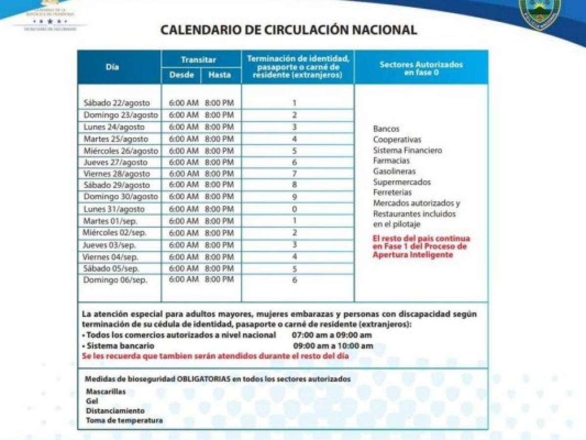 La Secretaría de Estado en el Despacho de Seguridad a través de la Policía Nacional de Honduras y en el marco del Sistema Nacional de Gestión de Riesgo (SINAGER), con relación a toque de queda absoluto, los informes de avance de la Fuerza Honduras y la baja en la presión hospitalaria, a la opinión pública comunica:1. Que, se determinó extender el Toque de Queda Absoluto en todo el territorio hondureño, desde el domingo 23 de agosto a las 09:00 pm hasta el domingo 06 de septiembre a las 11:00 pm ampliando la circulación los fines de semana; autorizando al sistema comercial y económico la atención a la población, de esta manera se avanza con la Fase I del Proceso de Apertura Gradual y Responsable. Los municipios que están en fase 0 continúan autorizando únicamente para apertura a supermercados, farmacias, bancos, cooperativas, ferreterías, sistema financiero en general, restaurantes del pilotaje, mercados autorizados y el sector maquilador, quienes atenderán a sus clientes según calendario de circulación nacional, así como por el último dígito de su cédula de identidad, pasaporte o carné de residente (extranjeros) con extensión de horario de 06:00 am a 08:00 pm.