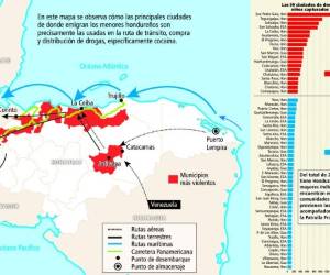 Mapa de ruta del tráfico de drogas y listado de ciudades de origen de los niños migrantes. 1 Niños huyen de las ciudades más violentas y con tránsito de droga