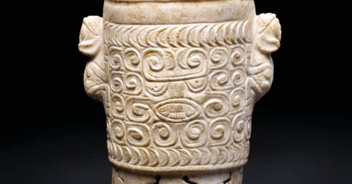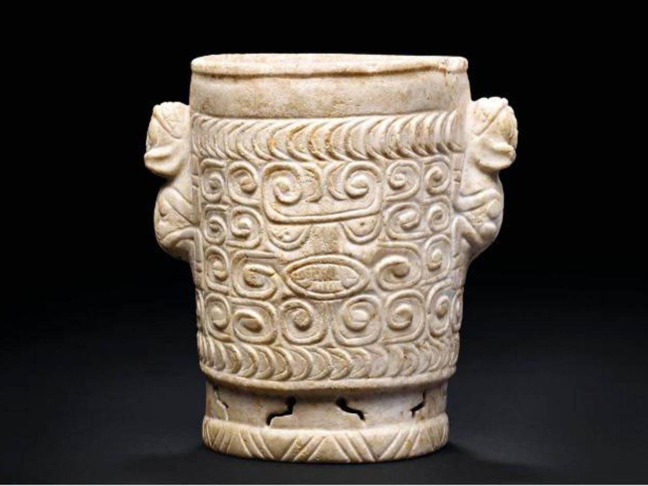 Esta última pieza, denominada en la subasta como Jarrón de mármol Maya, valle de Ulúa, del clásico terminal, mide 18.6 centímetros de alto, y es descrita por Christie’s como una vasija cilíndrica tallada en cada lado con una cabeza zoomorfa estilizada con ojos semilunar, boca ovoide y volutas opuestas en la frente, rodeada en su totalidad con bandas de volutas, con asas en forma de felinos.