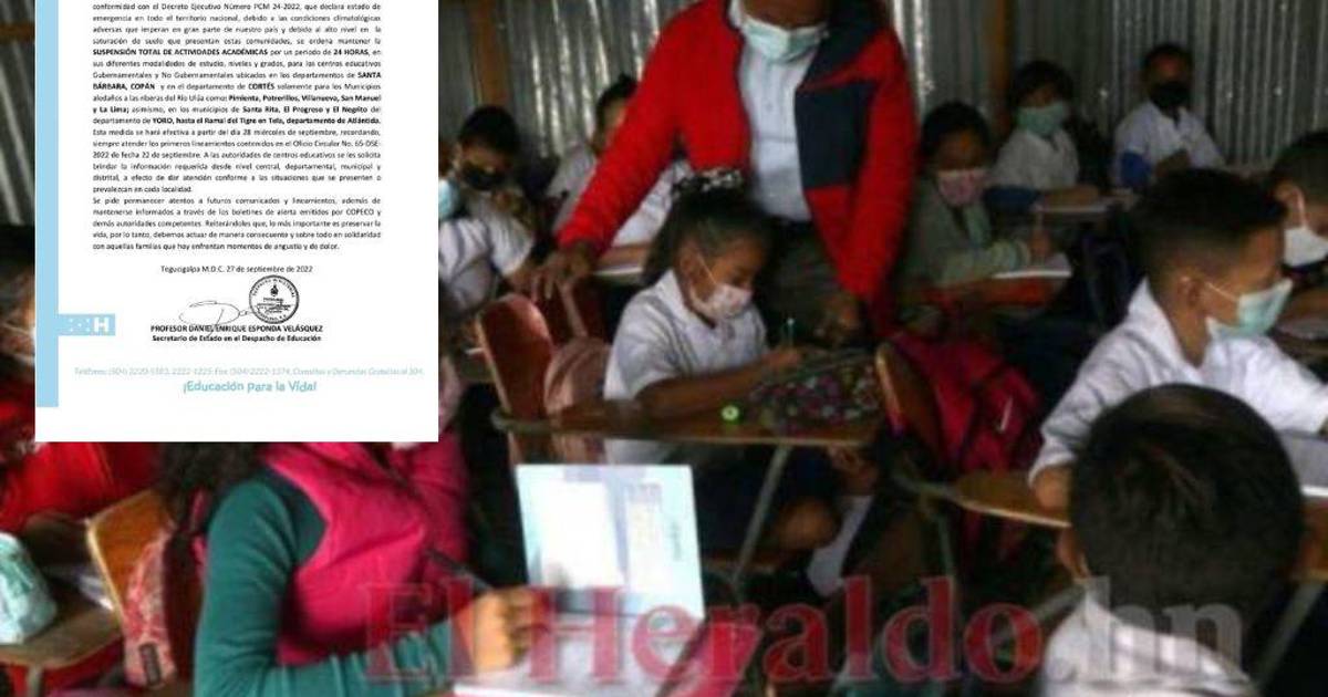TEGUCIGALPA, HONDURAS.- La Secretaría de Educación anunció la noche de este martes que se suspenden las clases del miércoles 28 de septiembre en escuelas públicas y privadas en los departamentos de Santa Bárbara, Copán y Cortés debido a las alertas por lluvias.