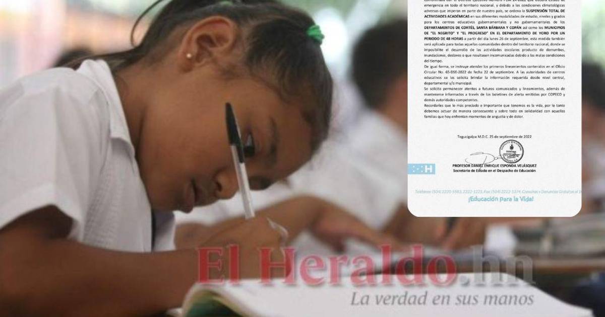 La suspensión de clases será por 48 horas, a partir del lunes 26 de septiembre, en los departamentos de: Cortés, Santa Bárbara y Copán. Así como los municipios de El Negrito y El Progreso del departamento de Yoro.