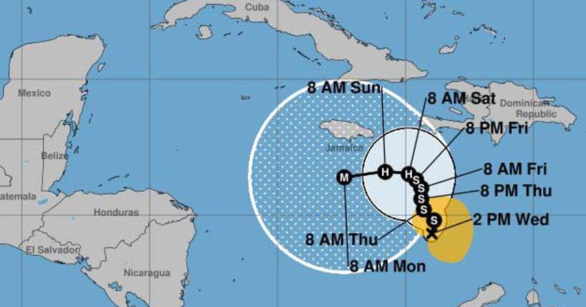 El documento indica que el sistema podría continuar avanzando lentamente sobre el mar Caribe Central, con un giro gradual hacia el noroeste y norte durante el fin de semana, acercándose a Haití como huracán el sábado y a Jamaica el domingo.