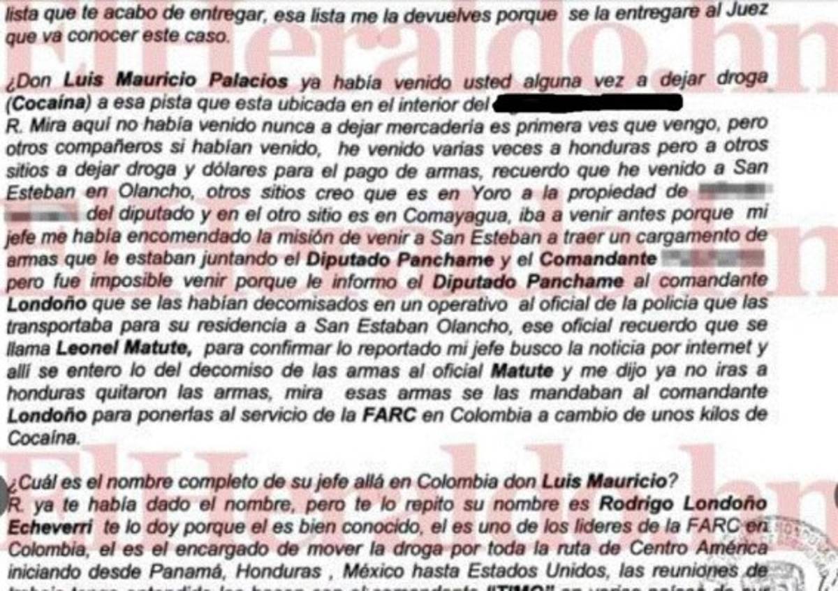 Iba a venir antes porque mi jefe me había encomendado la misión de venir a San Esteban a traer un cargamento de armas que le estaban juntando el diputado Panchamé y el comandante (...), pero fue imposible venir porque le informó el diputado Panchamé al comandante Londoño que se las habían decomisado en un operativo al oficial de policía que las transportaba para su residencia a San Esteban. Ese oficial recuerdo que se llama Leonel Matute, para confirmar lo reportado mi jefe buscó la noticia en Internet y ahí se enteró del decomiso de las armas al oficial y me dijo ya no irás a Honduras, quitaron las armas”.