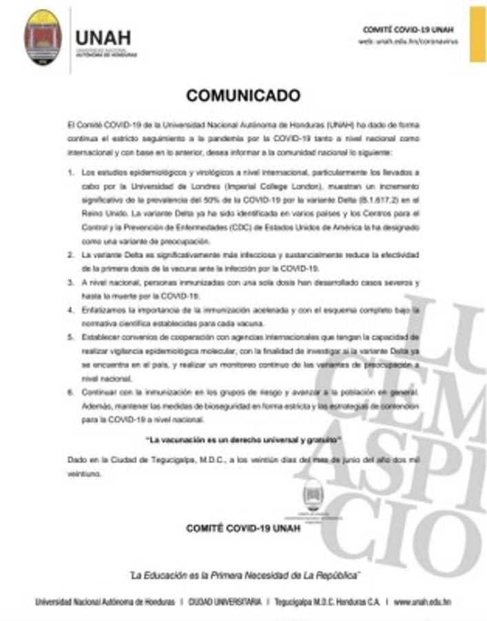 Siendo Delta una variante designada como 'de preocupación', autoridades de la UNAH señalaron la 'importancia de la inmunización acelerada y con el esquema completo bajo la normativa científica establecida para cada vacuna'.