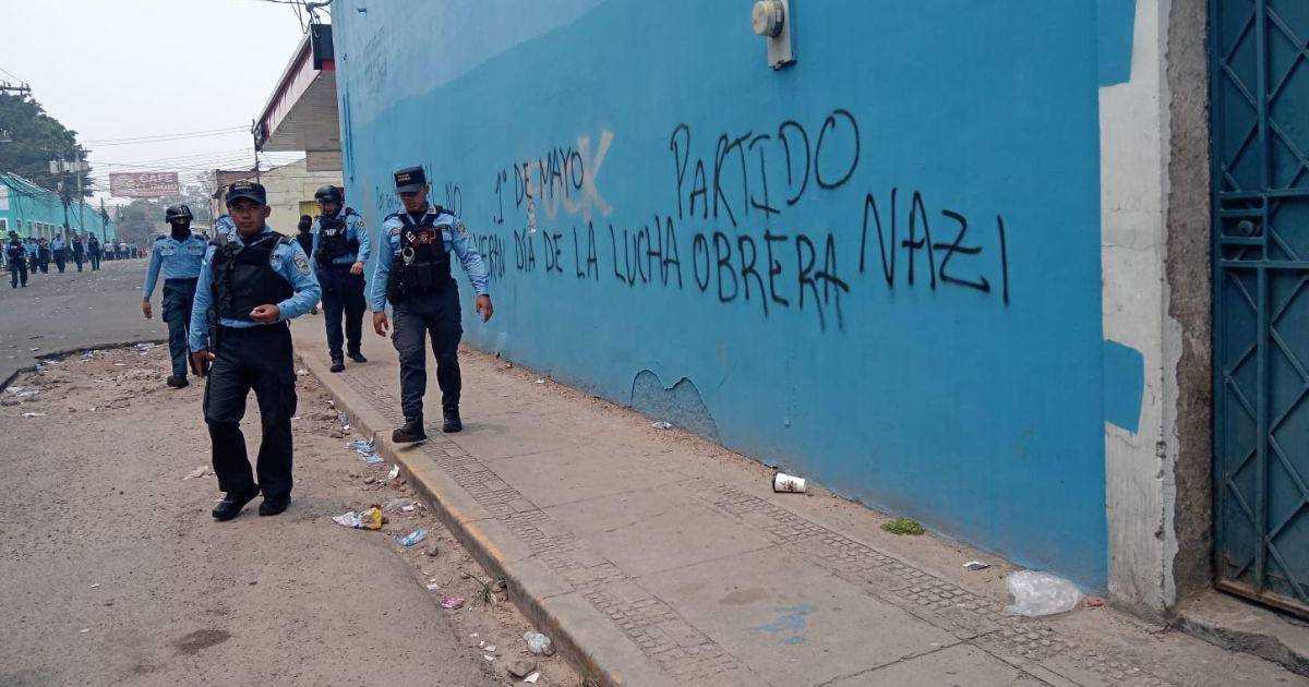 “1 de mayo, día de la lucha obrera, partido nazi, se fue JOH siguen los demás”, decía entre las frases que se leían en las paredes azules del Partido de Oposición.