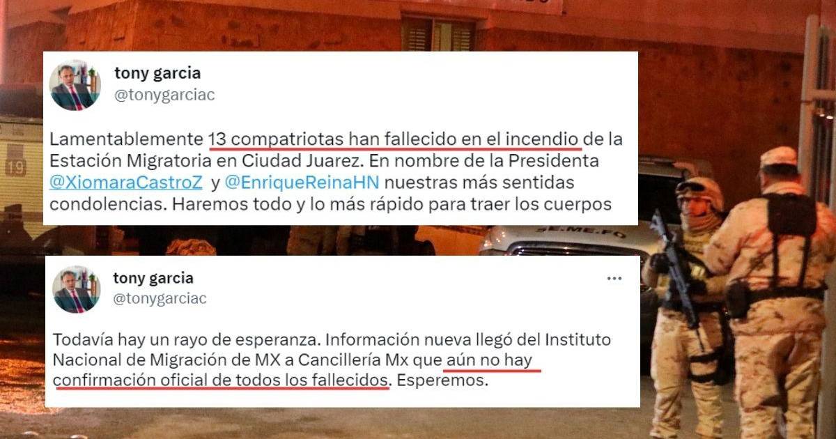 El vicecanciller escribió a la 1:33 de la tarde (Hora de Honduras) el siguiente aviso en Twitter: “iLamentablemente 13 compatriotas han fallecido en el incendio de la Estación Migratoria en Ciudad Juarez. En nombre de la Presidenta @XiomaraCastroZ y @EnriqueReinaHN nuestras más sentidas condolencias. Haremos todo y lo más rápido para traer los cuerpos”. Dos horas más tarde, a las 4:05 PM (hora de Honduras), su mensaje contradecía la tragedia. “Todavía hay un rayo de esperanza. Información nueva llegó del Instituto Nacional de Migración de MX a Cancillería Mx que aún no hay confirmación oficial de todos los fallecidos. Esperemos”, escribió en la misma red social.