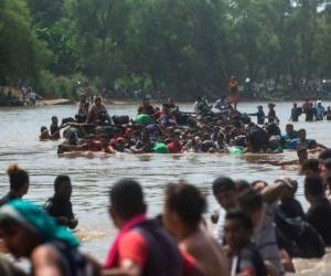 En las imágenes se observa al grupo de centroamericanos, quienes hacen hasta lo imposible para pasar el río, mientras un helicóptero sobrevuela a pocos metros de altura.