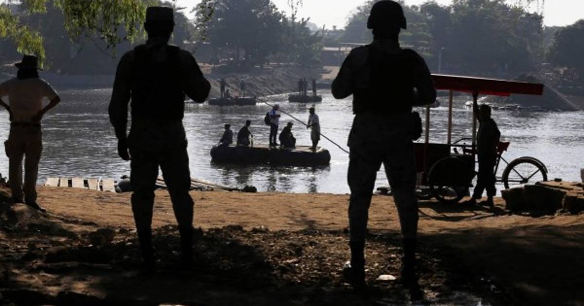 Elementos de la guardia interceptaron a la caravana en las afueras de la comunidad de Frontera Hidalgo, cerca de Ciudad Hidalgo, en donde los migrantes cruzaron el río al amanecer.