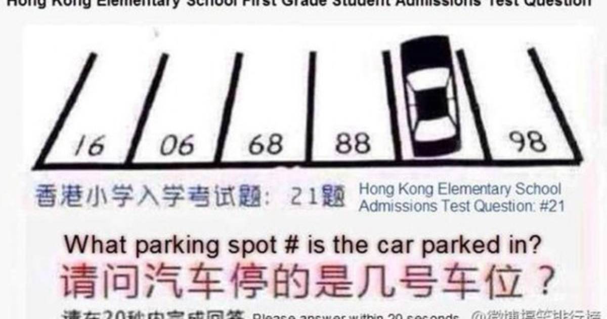 Presentado como el 'número 21' de una serie de preguntas por resolver para lograr el ingreso a la Escuela Elemental de Hong Kong, el acertijo propone descifrar el 'número de aparcamiento en el que está el automóvil que figura en la imagen', donde se muestran diversos espacios vacíos.
