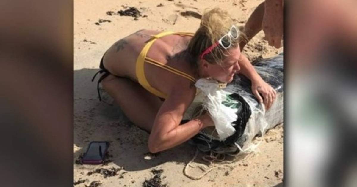 En la imagen, que se volvió viral, la fémina usa un bikini amarillo y lentes en la cabeza, mientras sujeta con fuerza el saco de alucinógenos.
