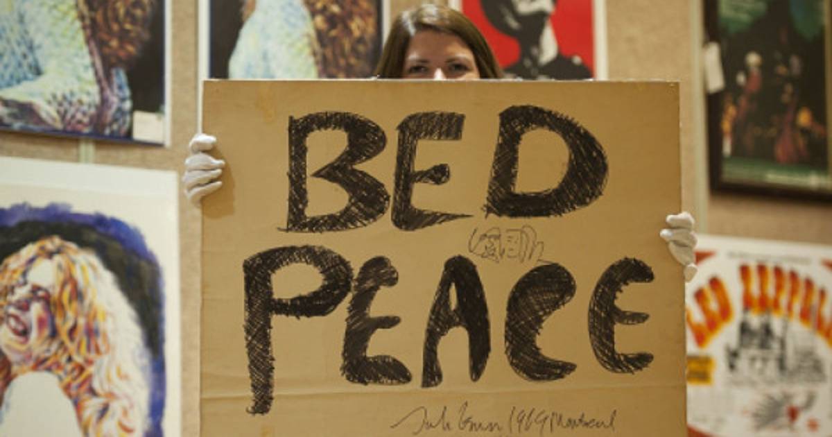 El panel blanco (de 71 sur 56), con las palabras 'bed peace' escritas a mano con un rotulador negro, estaba colocado en la habitación del hotel de Montreal donde la pareja se manifestó contra la guerra de Vietnam sin salir de la cama del 26 de mayo al 2 de junio de 1969.
