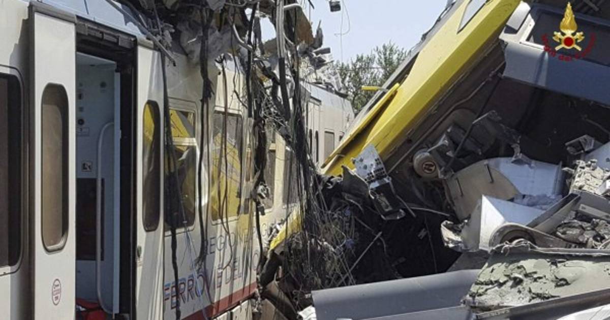 Dos trenes de pasajeros, cada uno de cuatro vagones, chocaron de frente el martes en la región de Puglia, en el sur de Italia, y al menos 12 personas murieron, informaron los bomberos.