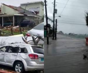 Algunas grabaciones muestran vehículos volcados en carreteras junto a casas cubiertas por la torrenciales lluvias y rótulos azotados por los fuertes vientos.