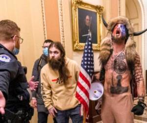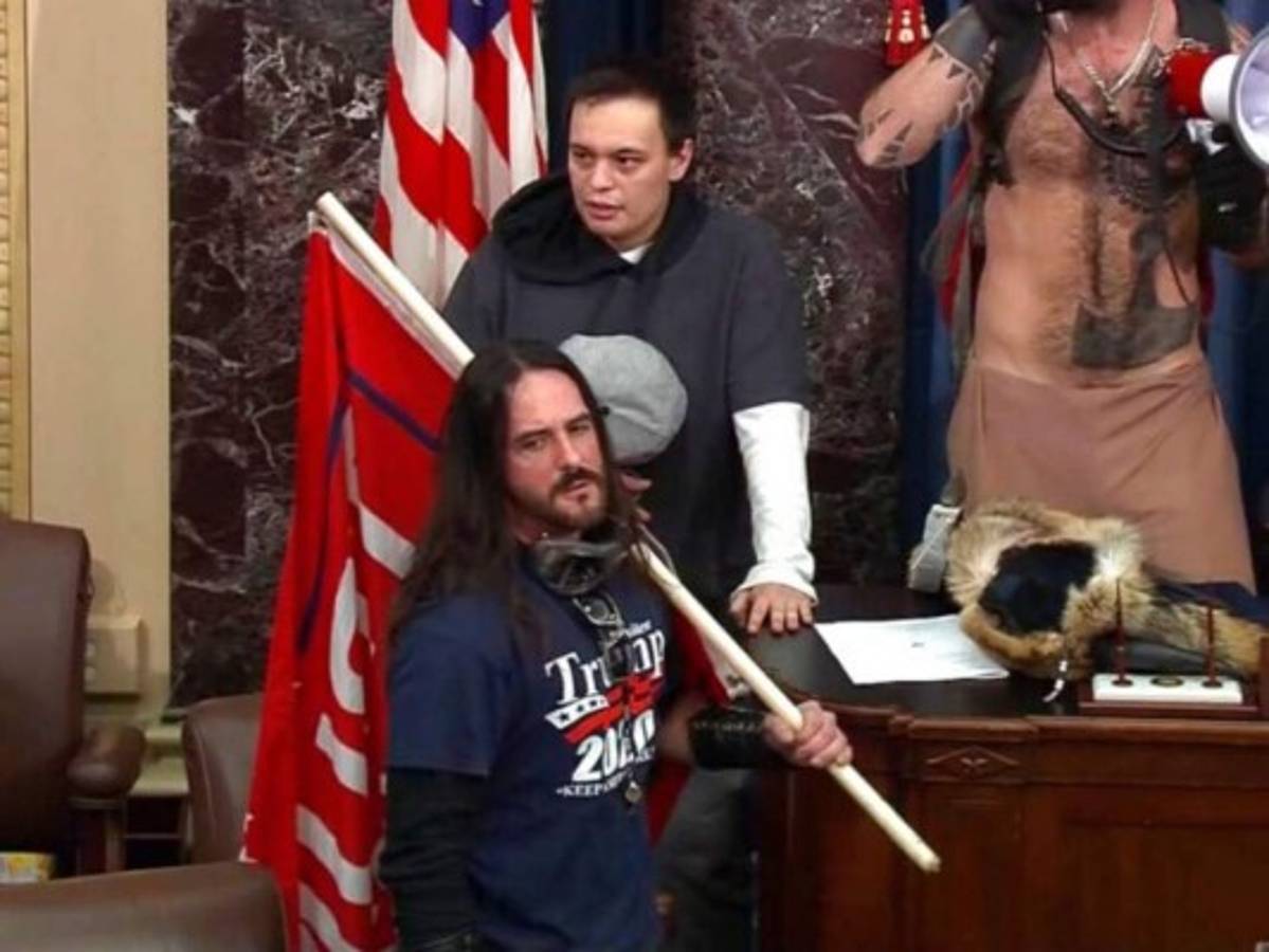 Un video muestra a Hodgkins, de 38 años, portando una camiseta de la campaña presidencial de Trump 2020, con la bandera al hombro y unas gafas protectoras alrededor del cuello en el interior del Senado federal. Se tomó un selfie con un autodenominado chamán que tenía un casco con cuernos y con otros alborotadores en el estrado detrás de él.