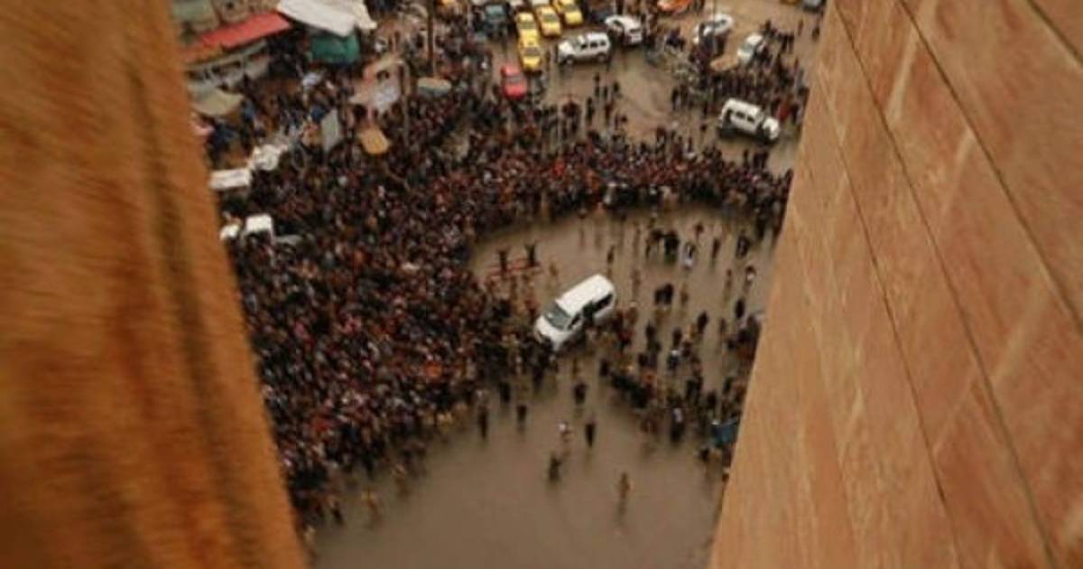 En la primera toma aparece una multitud congregada en una plaza en un día nublado. La imagen se tomó desde la parte superior de un edificio de unos siete pisos, desde donde serán lanzadas las víctimas. 'Los musulmanes acuden a presenciar cómo se aplica la ley', reza la imagen.