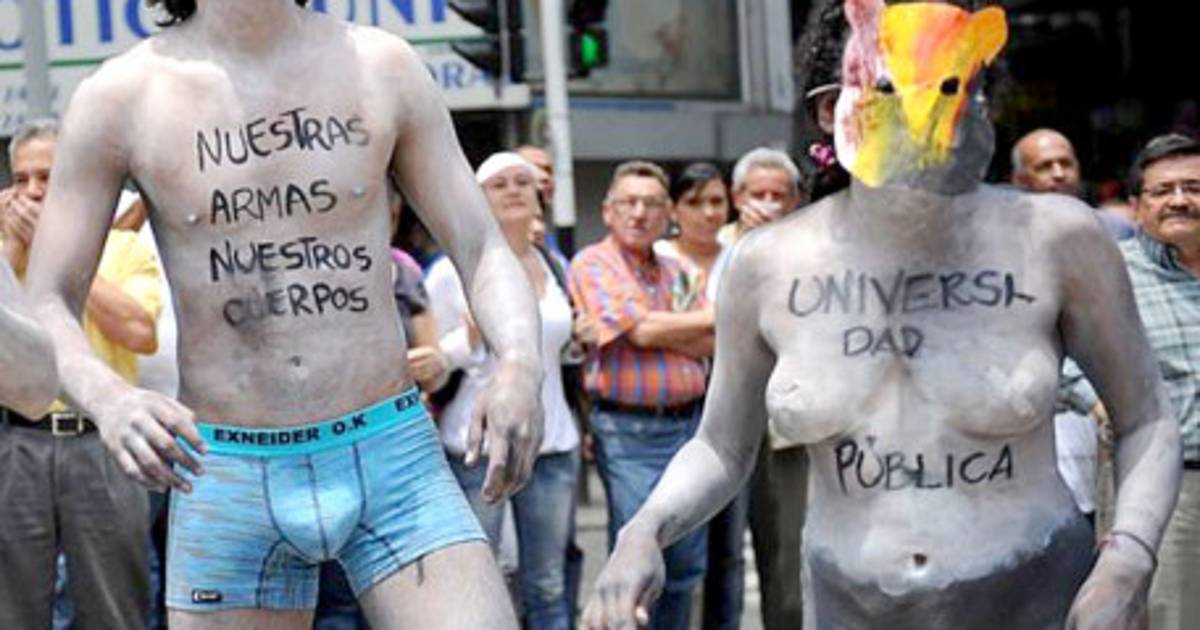 Sin embargo, una decena de jóvenes se desnudaron completamente en la Plaza de Bolívar, plaza mayor de la ciudad, y otros marcharon con el torso al aire, con consignas pintadas.