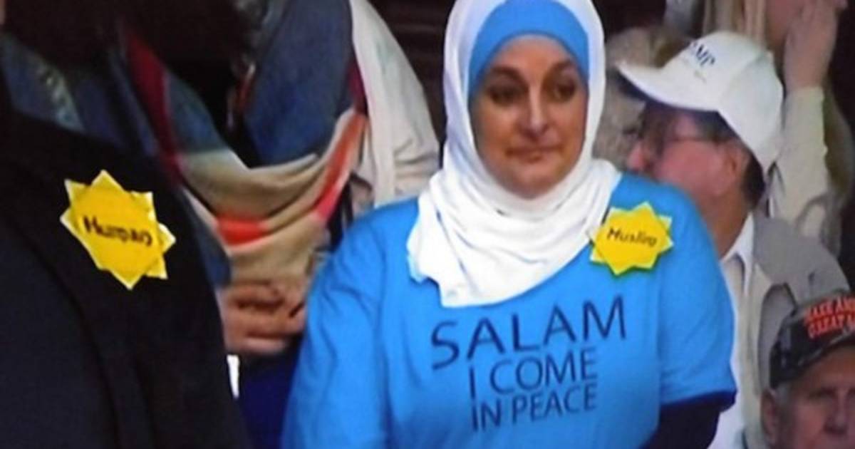 Imágenes de televisión muestran un acto en Carolina del Sur (este) en el que una mujer, llamada Rose Hamid, azafata de 56 años, lleva un pañuelo en la cabeza y una camiseta verde holgada en la que se puede leer: 'Salam. Vengo en paz'.