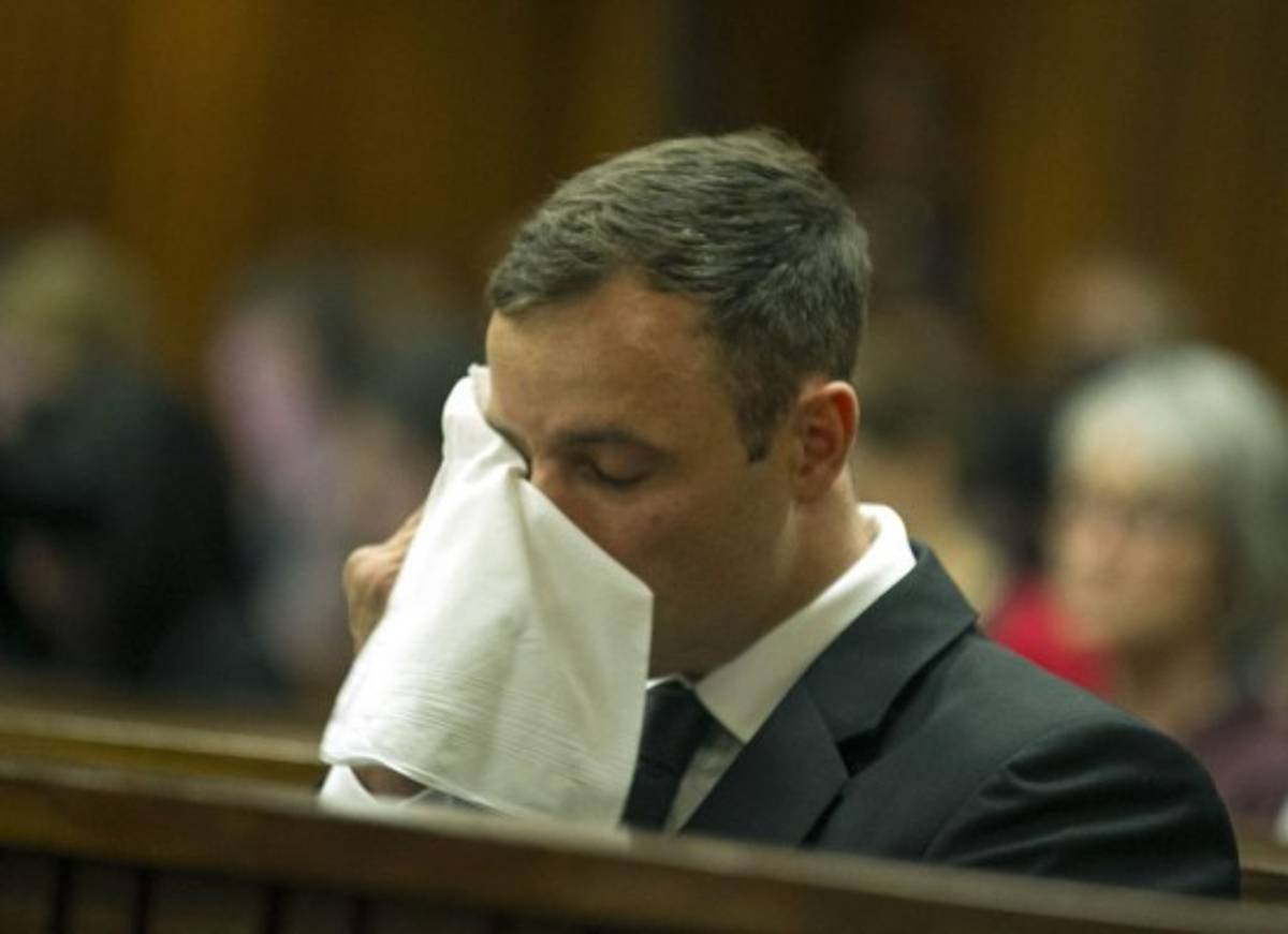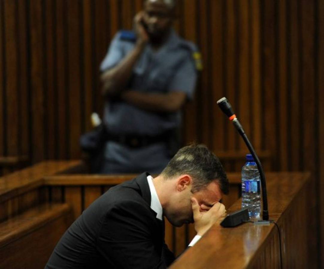 En un momento de la vista, Pistorius lloró mientras permanecía sentado en un banco de madera detrás de su letrado.