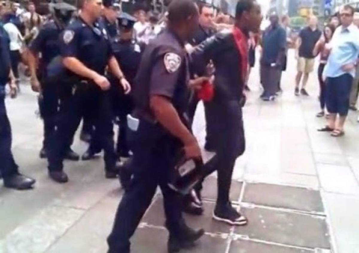 La policía de Nueva York dijo que el agente agredido -uno de 50 patrullando el área turística- intervino luego que Bishop demandase al menos cinco dólares a una mujer con la que posó para una foto, en lugar del dólar que esta le ofreció.